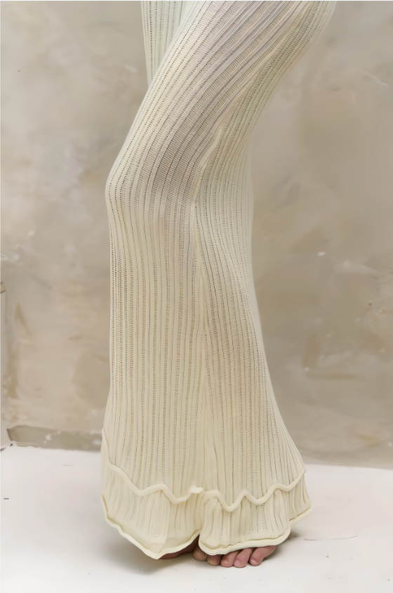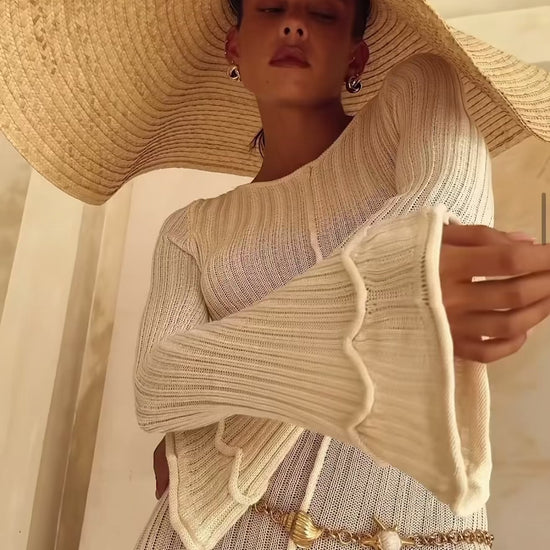 En un suave amarillo pastel, este vestido evoca la frescura de los cítricos y la luz del sol en la mañana. Destaca por sus mangas acampanadas y el bajo del vestido, ambos con un sutil borde ondulado que añade un toque romántico y artesanal. Su tejido de punto acanalado le da una textura rica y una caída fluida que se adapta a tu movimiento.