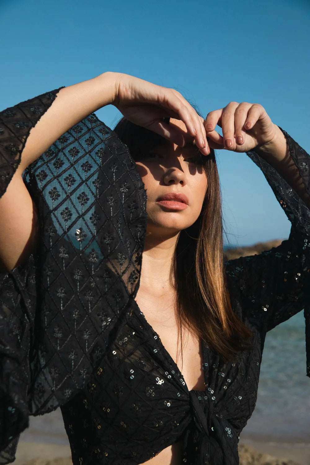El top crop presenta un favorecedor escote en V con cierre de lazada frontal y mangas acampanadas con detalles de volantes, aportando un aire bohemio y festivo. Tanto el top como el short están adornados con pequeños toques de lentejuelas o brillos discretos que capturan la luz y añaden un encanto único.