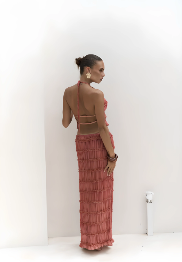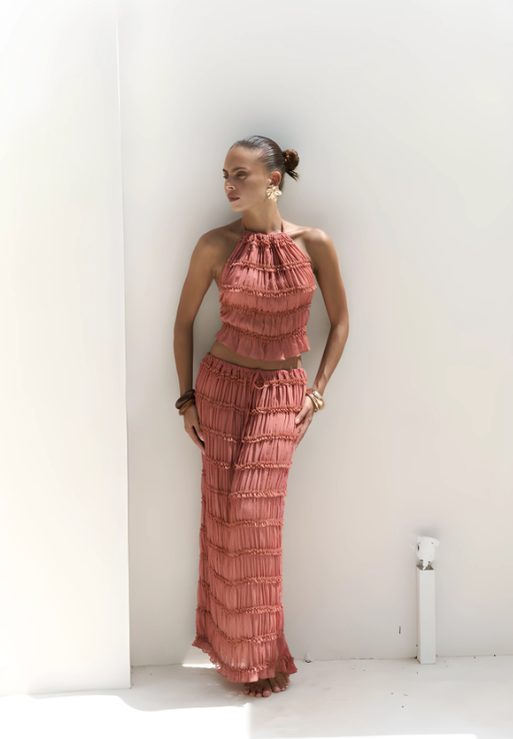 El Britta Top es una pieza versátil que combina estilo y comodidad de una forma excepcional. Confeccionado en un tejido ligero y con una textura fruncida en un hermoso tono terracota, este top evoca la calidez de un atardecer.