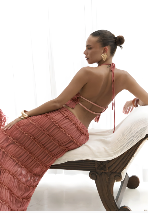 Su diseño tipo halter, con escote fruncido que se ajusta perfectamente a la silueta, es ideal para los días soleados. Gracias a su elasticidad y los lazos de ajuste, el top es de talla única y se adapta cómodamente desde una talla XS hasta una L, ofreciendo un ajuste perfecto para cada cuerpo.