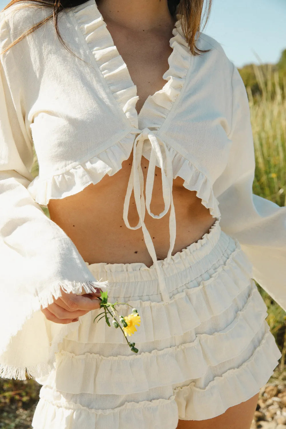 Completa el look con el top crop, con un favorecedor escote en V y un coqueto fruncido con volantes en los bordes, se ajusta con lazada delantera, permitiendo un toque personalizado y sensual. Sus mangas largas acampanadas le otorgan un movimiento etéreo y un estilo relajado.