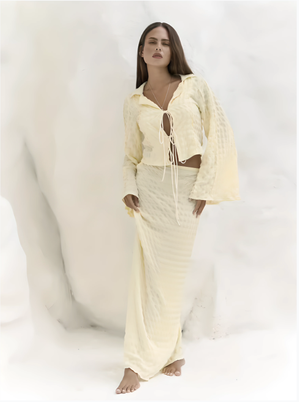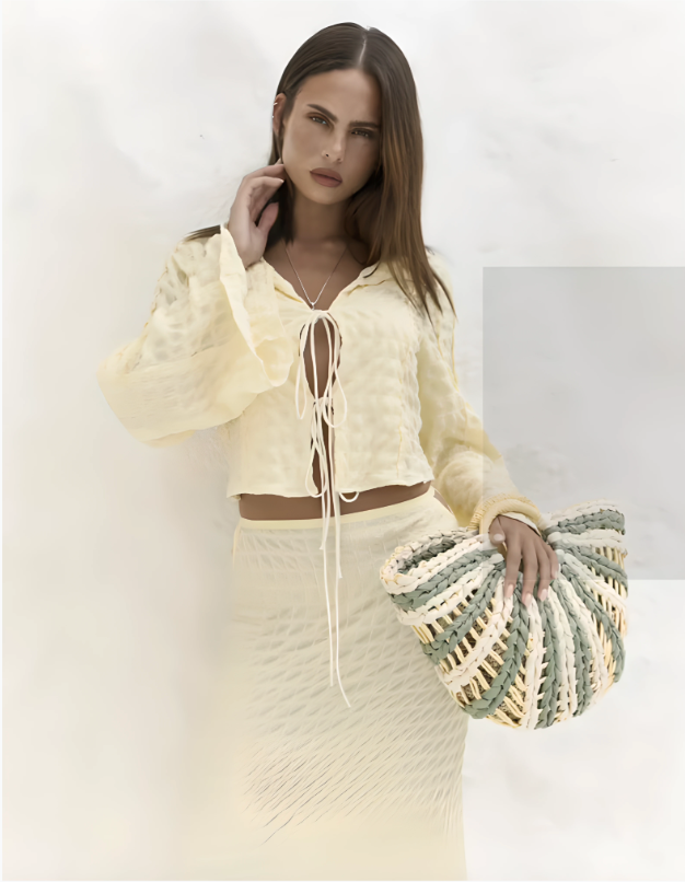 Captura la esencia de la luz y la libertad de Ibiza con este etéreo top crop. Confeccionado en un tejido ligero con una delicada textura gofre, su suave tono amarillo pálido es perfecto para los días soleados.