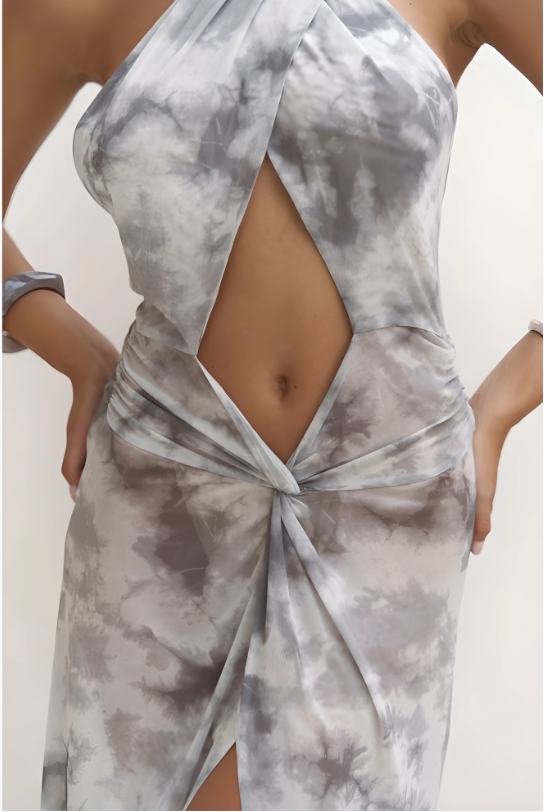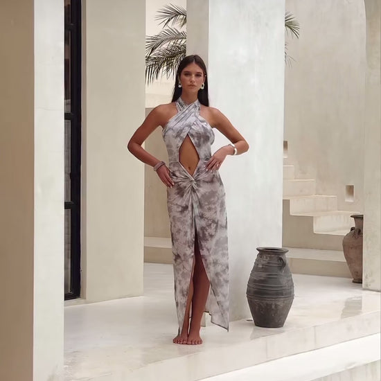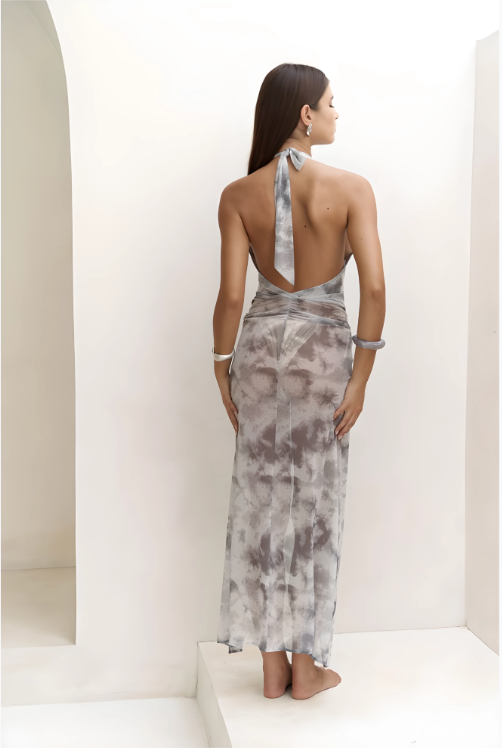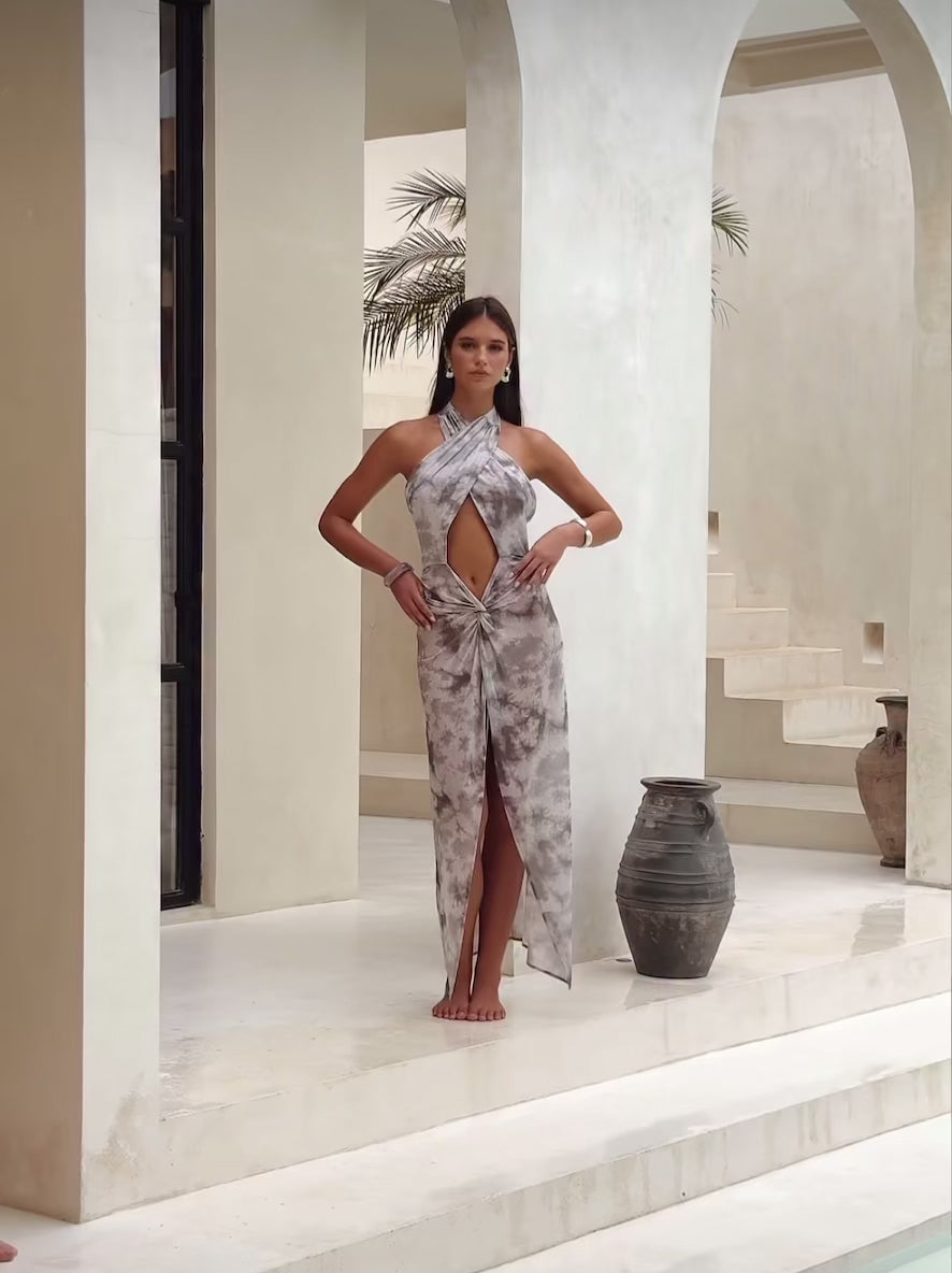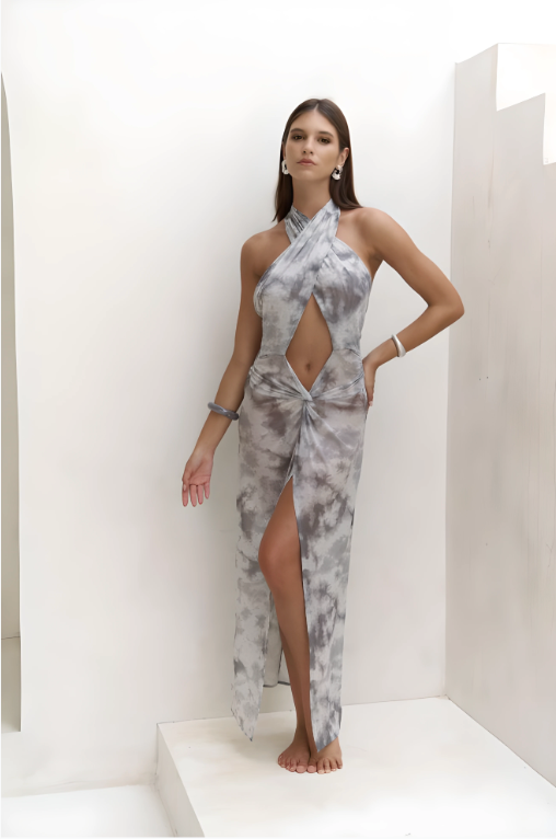 El estampado tie-dye en tonos grises y blancos evoca las nubes al atardecer, dándole un toque moderno y bohemio a la vez. Su corte midi y la sutil abertura en la pierna añaden un aire de sensualidad y fluidez con cada paso.