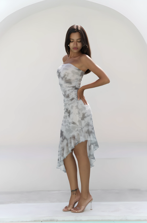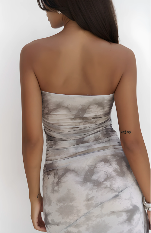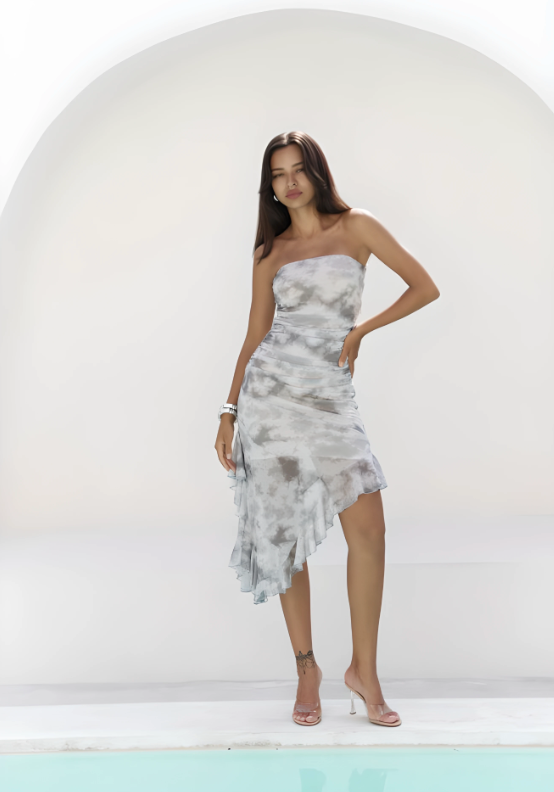Confeccionado en un estampado tie-dye en tonos de azul y gris, el vestido evoca la tranquilidad de las olas y las nubes de un cielo de verano. El top, con su diseño estilo corsé y escote recto, añade un toque de estructura y sofisticación, mientras que la falda larga y lisa cae con gracia, permitiendo un movimiento suave y delicado que evoca la brisa del mar.
