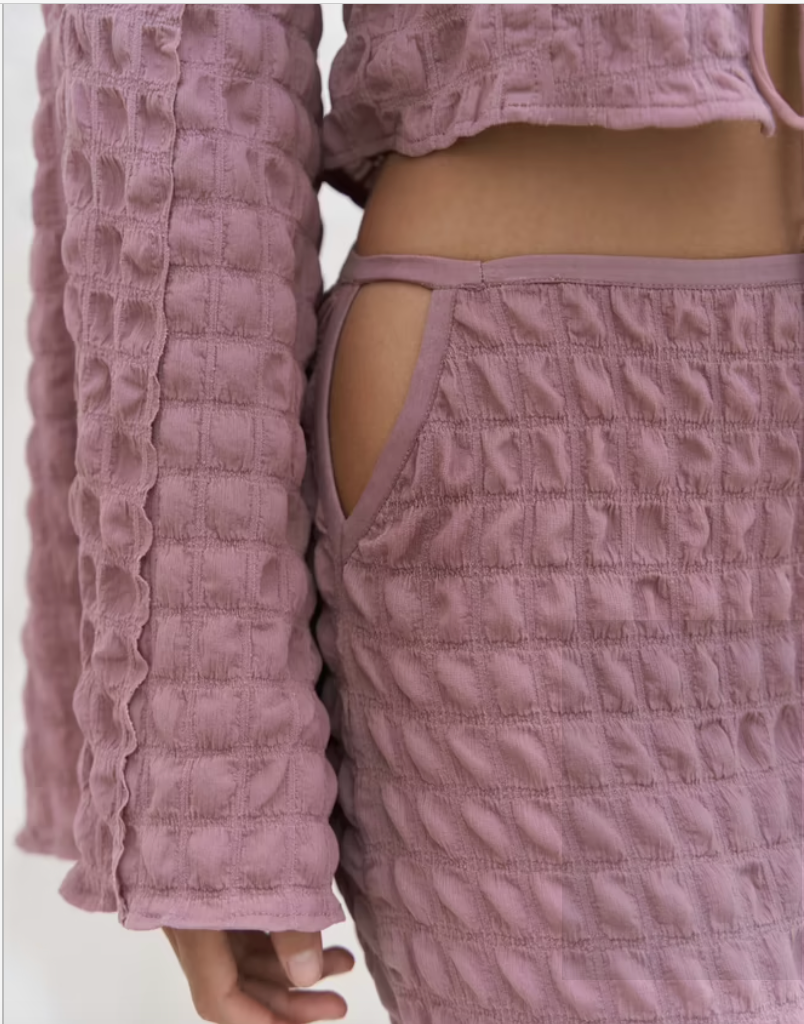 Descubre la versión en rosado empolvado de nuestro adorado top crop, una pieza que infunde la calidez y el encanto de un atardecer ibicenco a tu estilo. Confeccionado en un tejido ligero con una delicada textura gofre, este top ofrece un tacto suave y una presencia visual única.