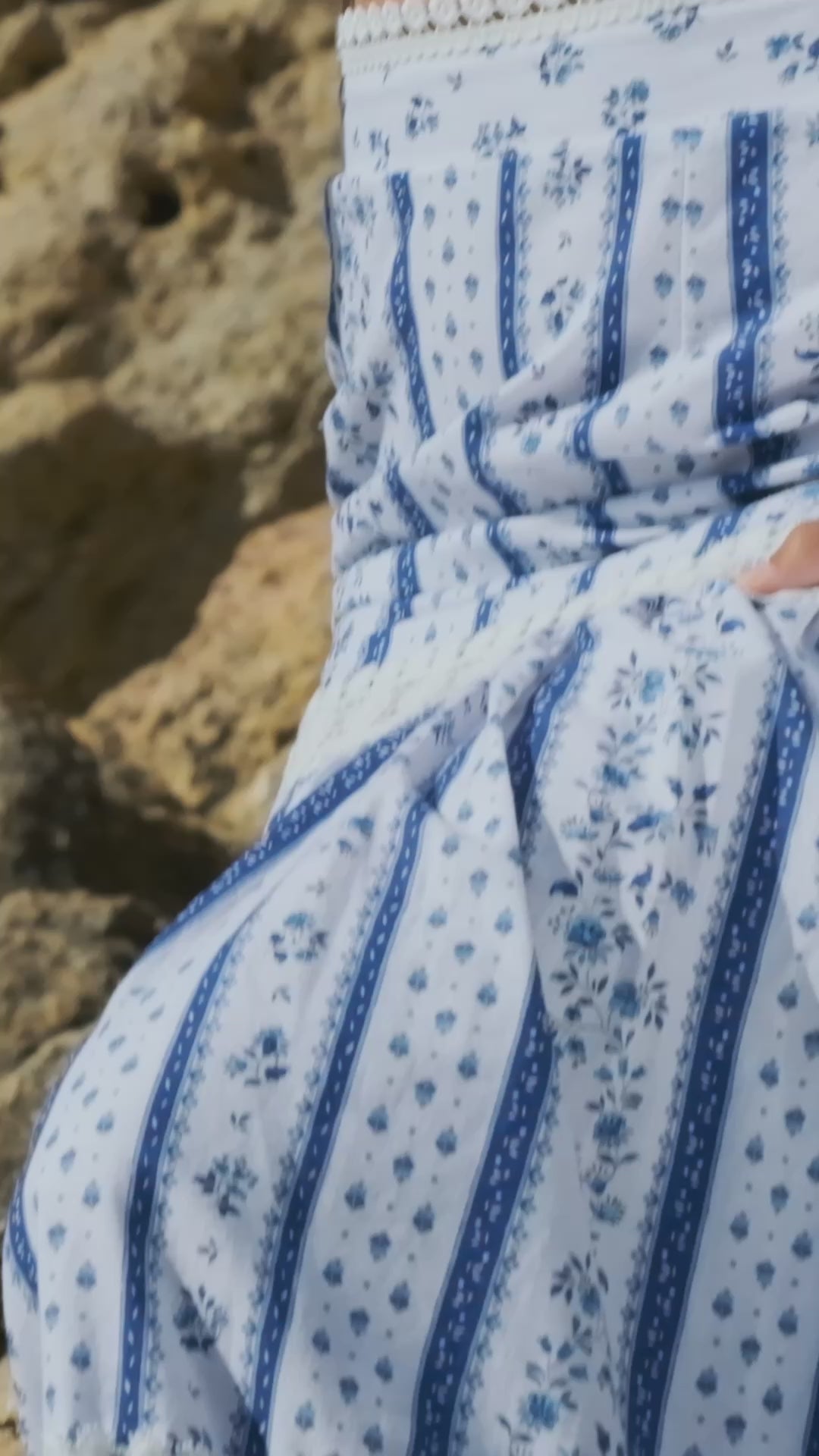 Femenina y con mucho movimiento, la falda Costa Bella destaca por su corte en A con doble volante en el bajo y cinturilla alta que realza la silueta.