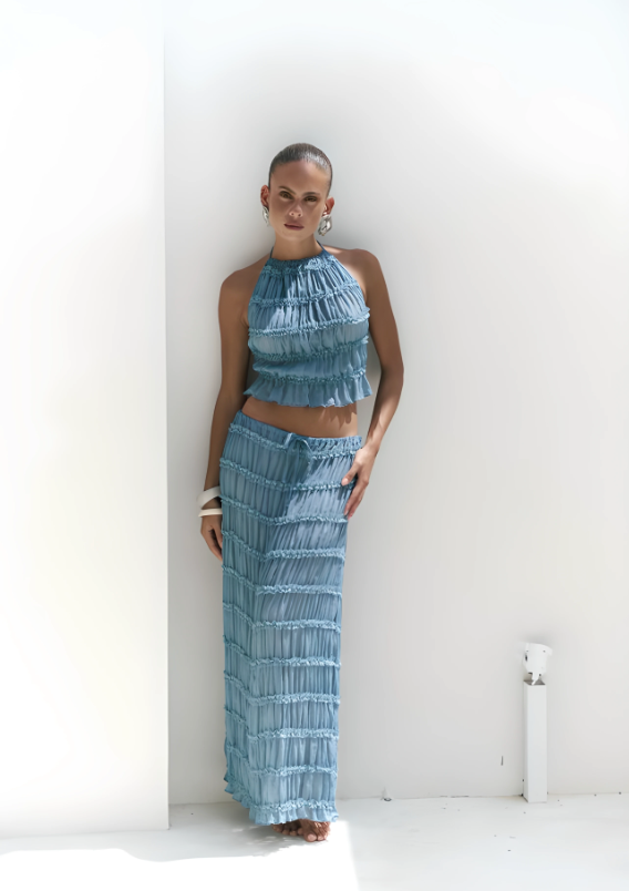 El Lea Top es una pieza versátil que combina estilo y comodidad de una forma excepcional. Confeccionado en un tejido ligero y con una textura fruncida en un sereno tono azul empolvado, este top evoca la tranquilidad de un día de mar.