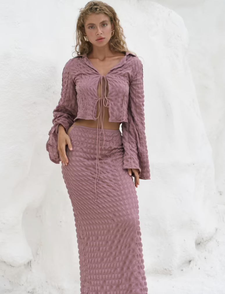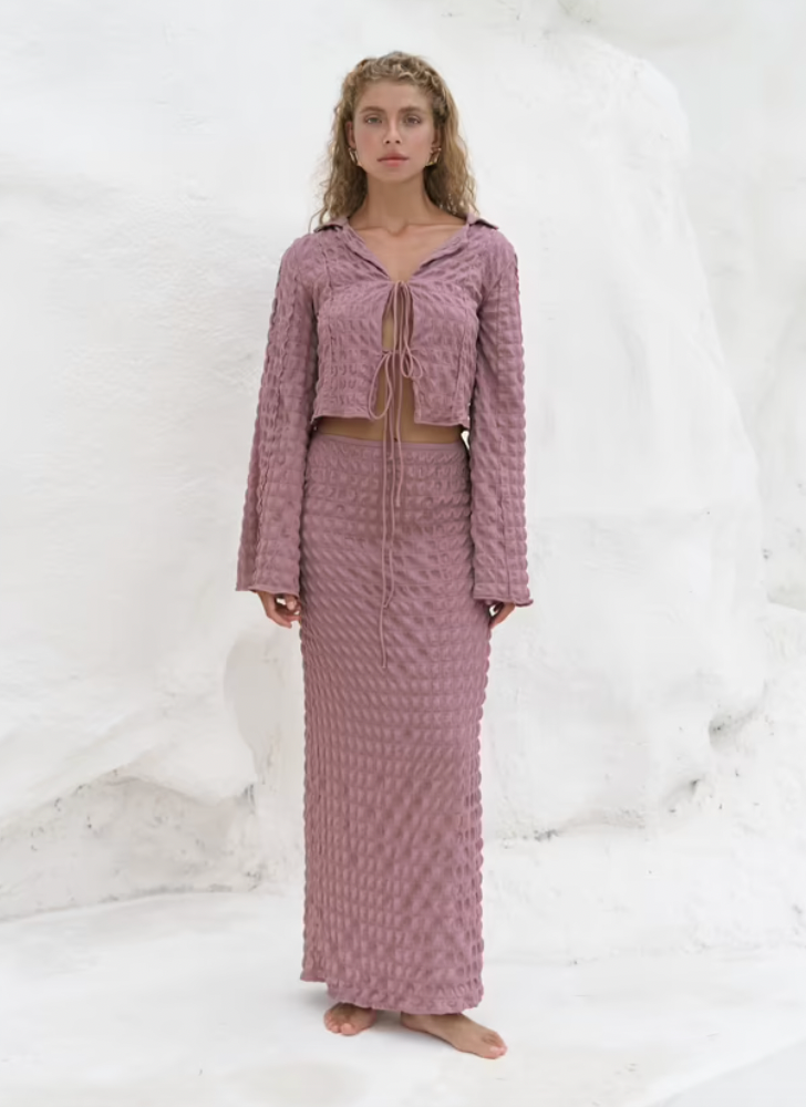Envuelve tu figura en la delicadeza y el encanto de esta falda maxi de corte largo en un precioso rosado empolvado. Confeccionada con nuestro característico tejido ligero y una sutil textura gofre, esta falda es una oda a la comodidad y el estilo.