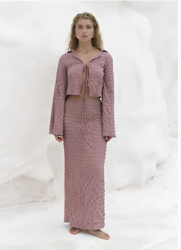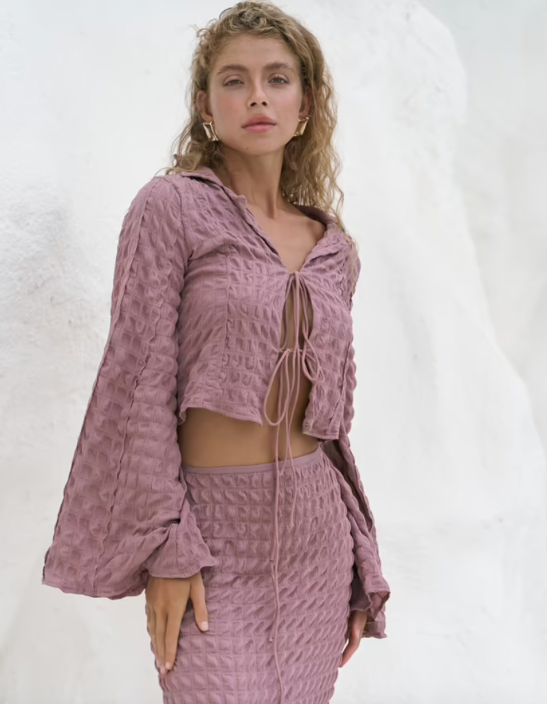 Descubre la versión en rosado empolvado de nuestro adorado top crop, una pieza que infunde la calidez y el encanto de un atardecer ibicenco a tu estilo. Confeccionado en un tejido ligero con una delicada textura gofre, este top ofrece un tacto suave y una presencia visual única.